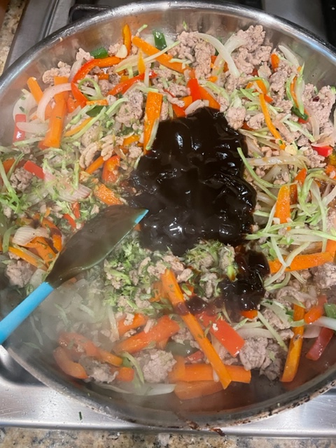 I started by browning a pound of ground pork, seasoned with kosher salt and pepper. To the cooked pork, I added onion, carrots, red pepper and jalapeño. I let the vegetables cook until they had started to soften slightly, about 5 minutes. I then added a cup of broccoli slaw from a package I picked up at the market and 4 cloves of minced garlic. After 30 seconds, I added the zest and juice of two limes which added a little brightness to the pork mixture. Next, I added hoisin sauce, soy sauce sweet chili sauce and rice vinegar. I mixed everything together, adding a pinch of red pepper flakes and a tablespoon of dried orange peel. I let the pork cook on low for about 5 minutes and in that time, I got my butter lettuce and toppings ready.