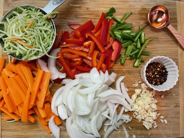 Carrots, Red Pepper, Onion, Jalapeño, Broccoli Slaw, Minced Garlic and Red pepper Flakes