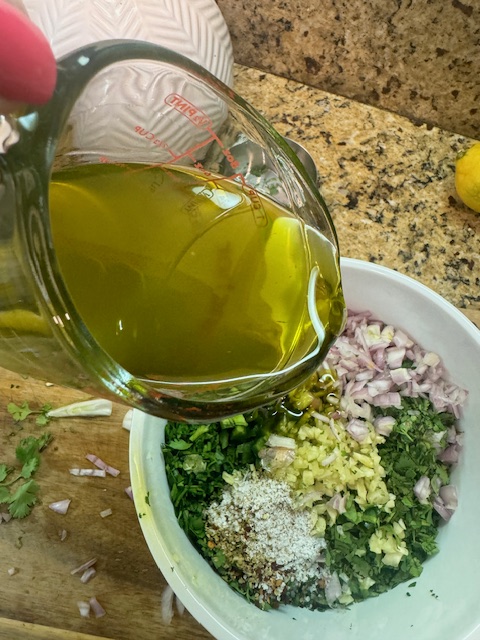 Start by washing flat leaf parsley and cilantro. Next, pour olive oil and white wine vinegar into a large measuring cup. To a large bowl, add your minced shallots, minced garlic, and diced jalapeńo, the zest and juice of one lemon, (remember to zest your lemon before squeezing the juice out of it … it’s a little tricky to zest an already juiced lemon!) kosher salt, pepper, crushed red pepper flakes, and dried oregano. Add the chopped parsley and cilantro to your measuring cup and mix everything together.