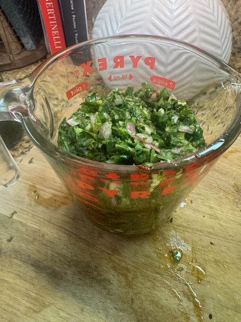 Pour the olive oil and vinegar into the bowl with the herbs and seasonings and stir everything together. Using a slotted spoon, I transferred the mixture back to my measuring cup and placed it in the refrigerator to use when I was ready. (I used a slotted spoon because I wanted my chimichurri sauce to be chunky and less saucy.)