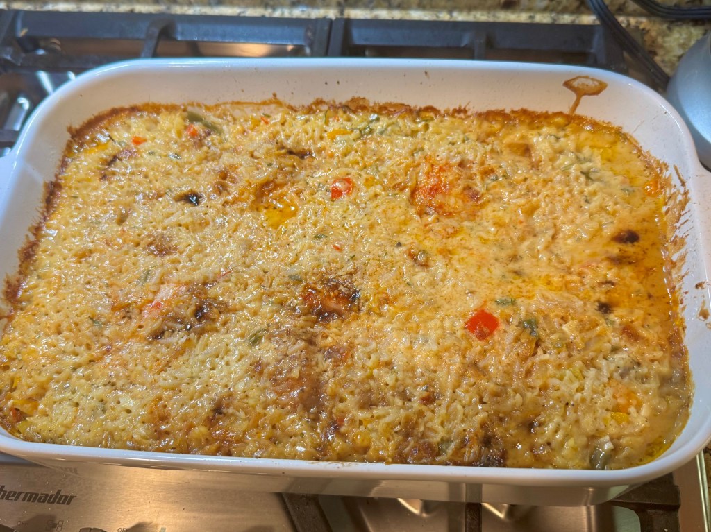 5. Pour rice mixture into a 9×13 that has been sprayed with non-stick cooking spray.