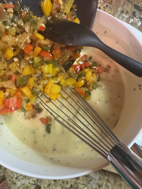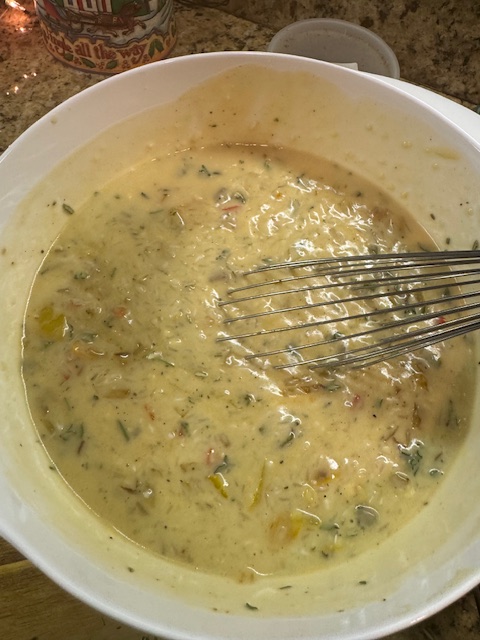 To begin with, I sautéd the onions, peppers and garlic. Once that was finished, I removed the skillet from the heat. In the meantime, I started by adding 1-1/2 cups of low sodium chicken broth and 1/2 cup white wine to a large measuring cup. To that, I added 2 tablespoons of dijon mustard, 1 package onion soup mix, 1 cup grated parmesan cheese, 1 rounded tablespoon fresh rosemary and 1 rounded tablespoon fresh thyme. I poured the mixture into a large bowl and added two cups of uncooked white rice. I whisked everything together and added the vegetables.