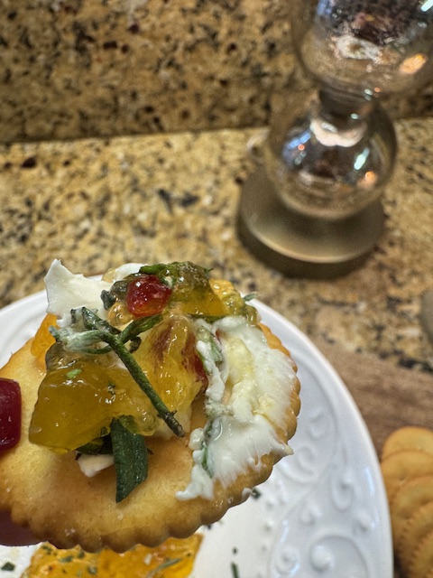 There are quite a few pepper jellies out there to choose from. I have good luck finding a nice variety at Home Goods. I usually have quite a few on hand because I use them for several different recipes. For this appetizer, I chose the apricot pepper jelly. I spooned a healthy amount on top of a block of cream cheese and sprinkled fresh rosemary on top for flavor as well as a little color to make it look festive and pretty.