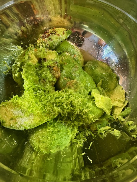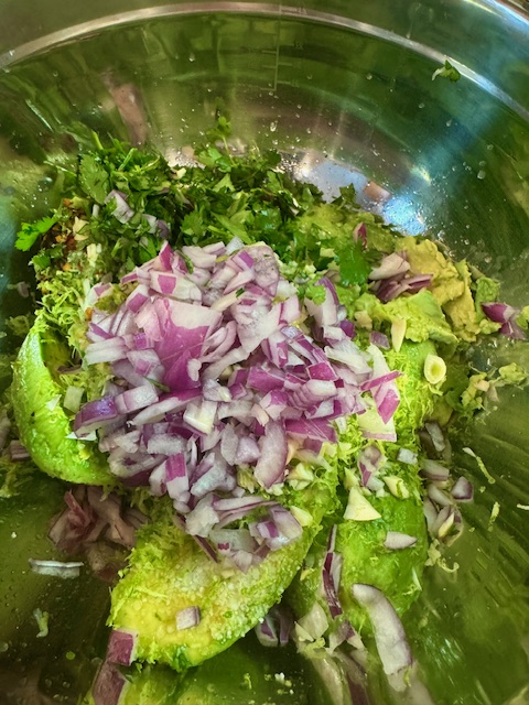 Once I had all 9 of the avocados in my bowl, I added the kosher salt, cumin and red pepper flakes. I then added the zest of two of the limes and the juice of all three. Next, I added the garlic and onion and mashed everything together with a potato masher. I then added the cilantro and gently folded it in. Once you have the guacamole mixed, place in a serving bowl, serve with tortilla chips and enjoy.