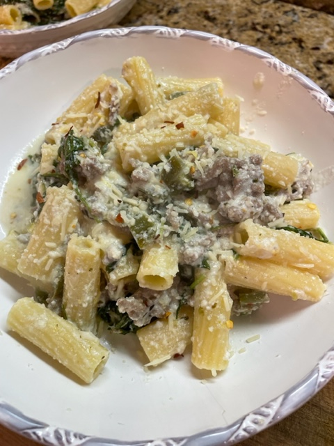 - Scoop ricotta onto sausage mixture and add lemon juice. Stir into pork and let cook together 5 minutes.